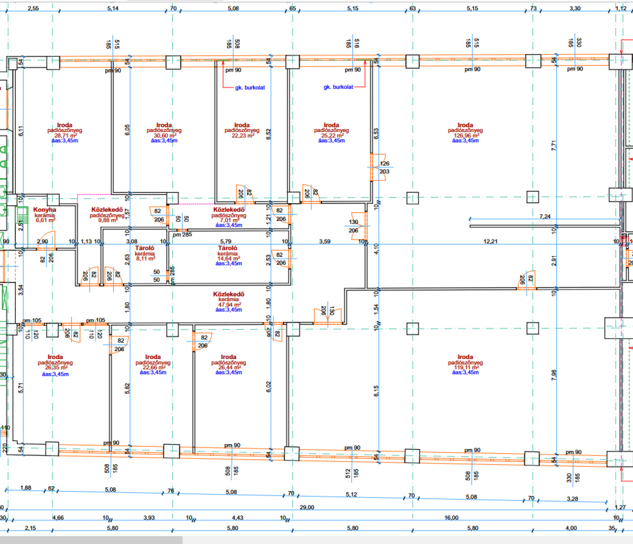 2. emeleten lévő irodák tetszőleges összevonásával alakítható bérlése a mellékelt alaprajz alapján. Narancssárgával jelölve összesen 250 m2 a citromsárga területeket is beleértve 277 m2 és a jelölt ajtónál lezárva. A tárolók falait ki is lehet bontani akár, ezzel a közlekedő rész is hasznossá tehető. Így egy teljesen különálló irodát kaphatunk. |