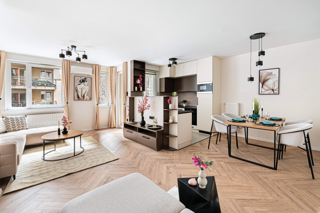 AIRBNB-ENGEDÉLLYEL rendelkező lakás eladó közvetlenül a tulajdonostól! A rövidtávú kiadás jelenleg is engedélyezett egy üzemeltető cégen keresztül, így azonnal extra bevételt termelhet befektetőként! A lakásról: A 69 m²-es, teljeskörűen felújított és lakberendező által megálmodott otthon az Akácfa utca egyik legjobb házában található. Az amerikai konyhás nappalihoz két külön nyíló hálórész, külön WC, modern fürdőszoba, valamint tároló tartozik. A lakás két, egyenként kb. 4 m²-es erkélyével és É-D-i fekvésével tágas, világos, mégis csendes. A kényelmet klíma, új beépített gépek (hűtő, sütő, főzőlap, elszívó), valamint minőségi burkolatok és világítások biztosítják. Mindkét hálóból kijárat nyílik az utcai erkélyre, a nappaliból pedig a belső udvarra nézőre. A fürdőben új kád és beépített mosdó található, külön helyiségben a WC és egy kézmosó. A lakás hang- és hőszigetelt műanyag nyílászárókkal szerelt, a fűtést központi kazán biztosítja, egyedi mérőkkel és alacsony rezsivel. A közös költség 50 000 Ft/hó, amely tartalmazza a fűtésátalányt, biztosítást, takarítást, szemétszállítást és karbantartást is. A házhoz saját parkoló is tartozik, ahol hely bérelhető vagy vásárolható. - A környékről: A lakás a VII. kerület belső részén, az Akácfa utcában található, kiváló infrastruktúrával. Pár lépésre: Spar, DM, gyógyszertár, éttermek, kávézók, valamint a 4-6-os villamos, trolibusz és metró is könnyen elérhető. A Városliget közelsége miatt tökéletes választás azoknak, akik szeretik a városi életet, de fontos számukra a természet és a kikapcsolódás is. - Kinek ajánlom? Ideális választás fiatal pároknak vagy befektetőknek, akik értékálló, azonnal kiadható ingatlant keresnek a belvárosban. A lakás tehermentes és azonnal költözhető. A vételár tartalmazza a teljesen új beépített konyhát és fürdőszobabútorokat. Igény esetén a teljes berendezés (bútorok, lámpák, lakástextilek) külön megállapodás alapján megvásárolható. Gyere el, és nézd meg személyesen – garantálom, hogy a valóságban még szebb, mint a képeken! |