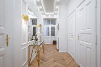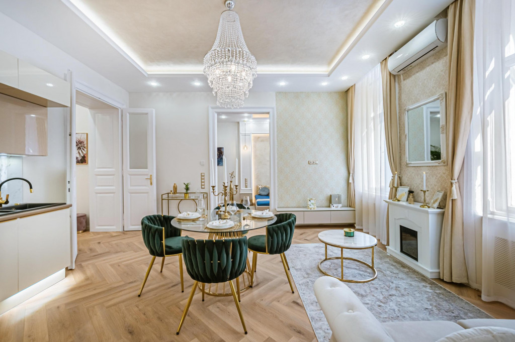 Belső -Terézváros csendes, nyugodt egyirányú utcájában, szép házban eladó ez a nagyon jó adottságokkal rendelkező, minőségi anyagokkal felújított lakás! A szép zöld belső udvarral és üveg lifttel rendelkező ház 1. emeletén található, ez a tulajdoni lapon 83 nm, valóságban 86 nm-es, amerikai konyhás nappali + 3 hálószobával, egy dolgozó szobával és egy háztartási helységgel rendelkező duplakomfortos lakás. A fürdőszobán kívül (zuhanyzó, kád is van) az egyik szoba külön zuhanyzóval is rendelkezik. Az ingatlant tágas terek és délkeleti tájolásának köszönhetően világosság jellemzi! A frissen elkészült ingatlan teljeskörű műszaki és esztétikai felújításon esett át. A kivitelező sokadik munkáját dicséri a nagy gonddal megtervezett dizájn, mely a nagypolgári hangulatot ötvözi a mai, modern luxus elemeivel, mely a legmagasabb színvonalon, a legigényesebb minőségben és exkluzív anyagokból készült.