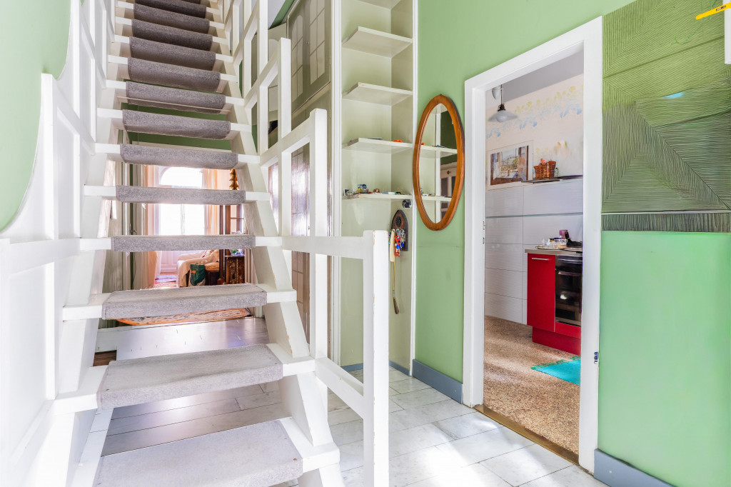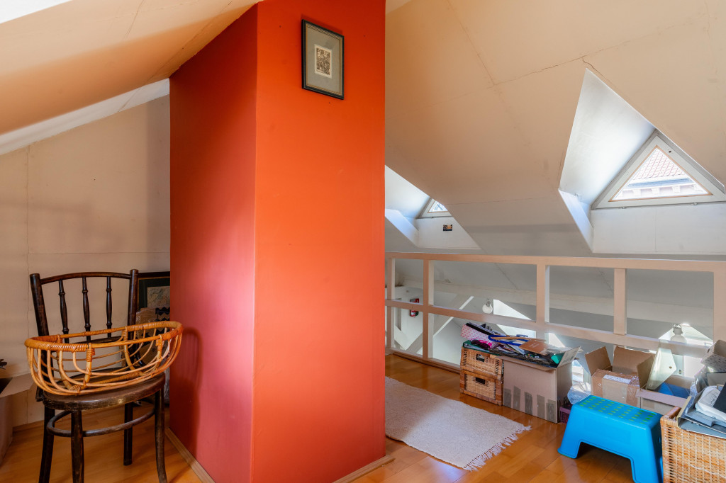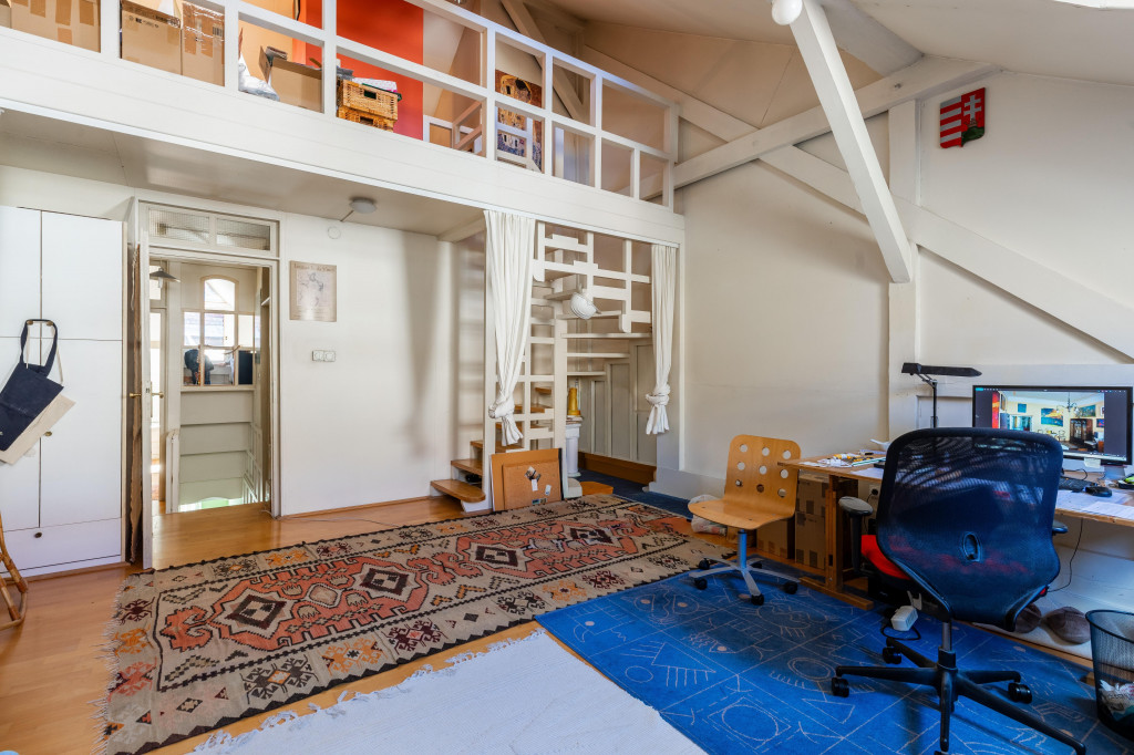 Az alsó szinten előszoba, külön, udvarra néző ablakos konyha, egy hálószoba, utcára néző nappali és fürdőszoba található, a tetőtérben két szoba és egy nemrég felújított fürdőszoba kapott helyet, míg a galériaszint további élettérként funkcionál. Ezek együttese különleges atmoszférát teremt.