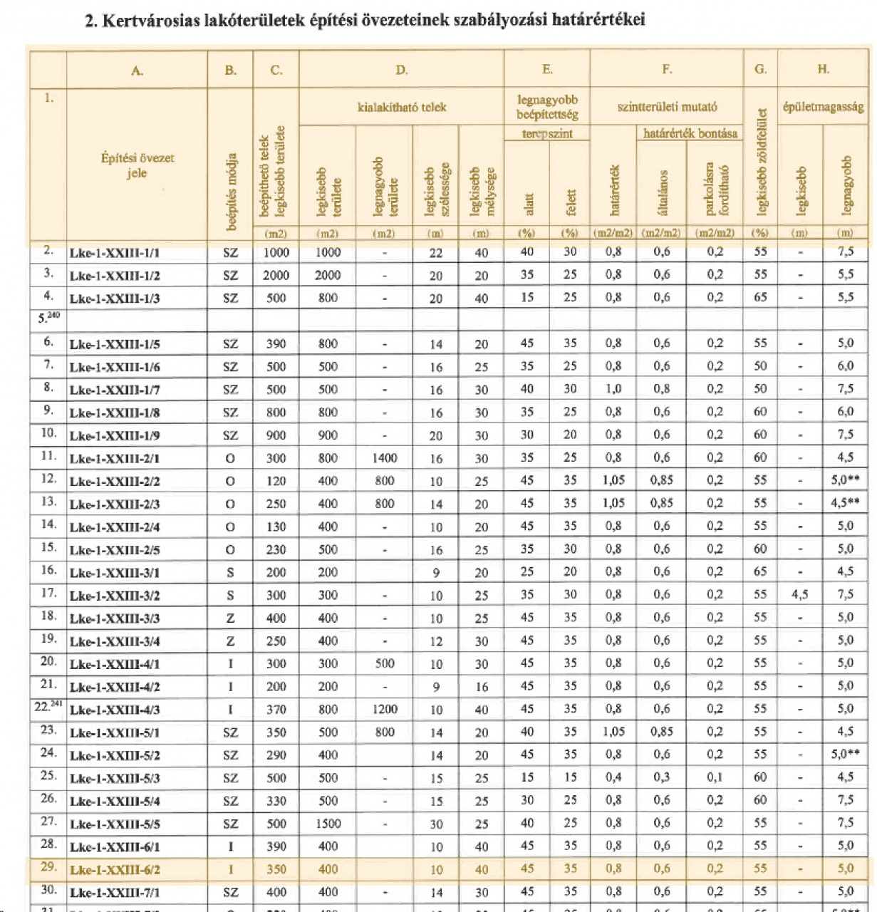 35% beépítési lehetőség, 5,0m építménymagasság lehetséges.