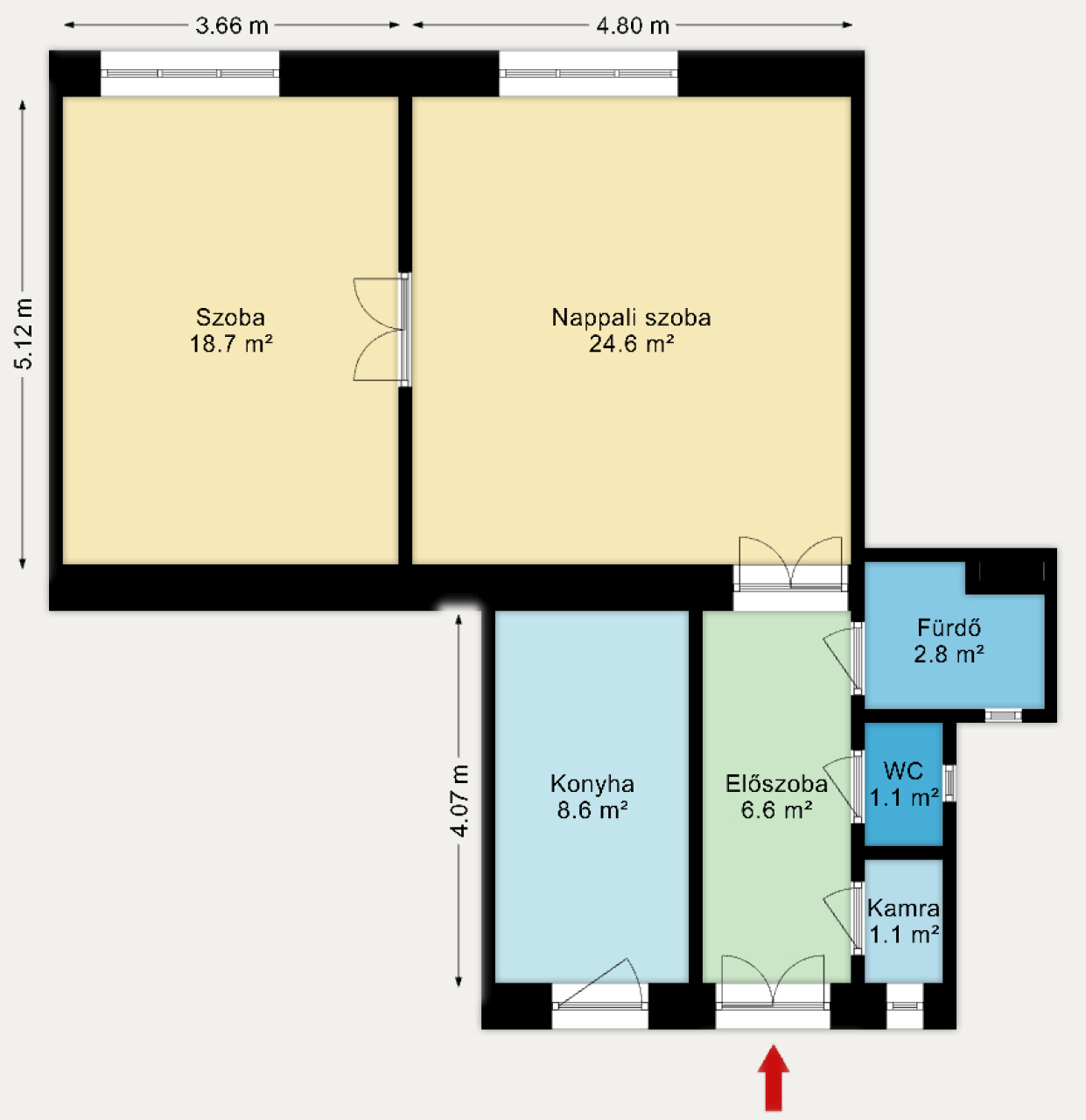 Az elosztás kiváló: előszobából nyíló konyha-étkező, kamra, külön ablakos WC, ablakos fürdőszoba, valamint két tágas, parkra néző szoba. A lakás világos, jól bútorozható, tisztasági festés után azonnal költözhető, de igény szerint tovább korszerűsíthető.